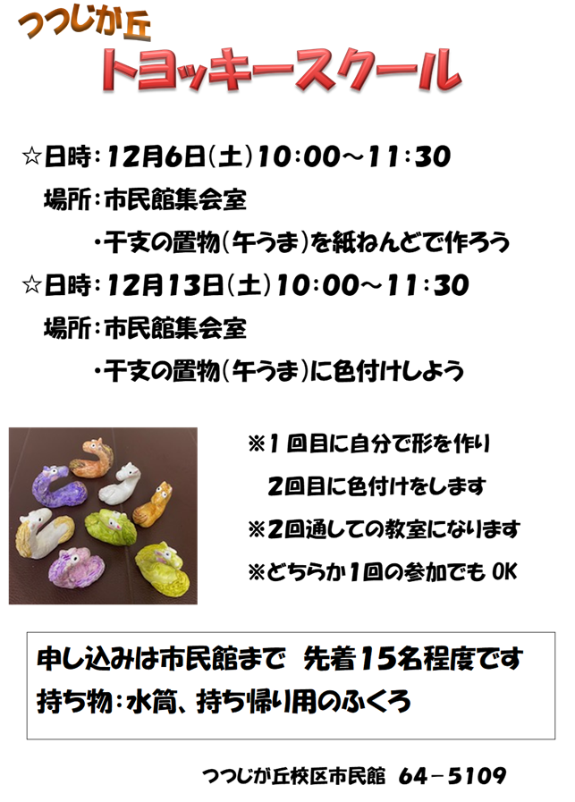 | 4 | 12月 6日(土)10:00 | 干支の置物(午うま)を粘土で作ろう | 15名 | |