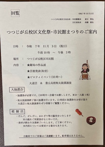 『 つつじが丘校区文化祭・市民館まつり』 館内清掃(窓、床ワックス)R7.9.16 市民館集会室の椅子(30脚)整備しました R7.9.11 市民館ピロティから運動場への「可動式扉」整備しました 『校区市民館はクールシェアスポットです』 ○クールシェアとは、暑い日にみんなで同じエアコンを使って休むことです ○平日の午後1時から6時まで ○暑い日の休憩場所としてどうぞご利用ください ○期間は10月22日までです 『つつじが丘校区市民館 消防訓練』 令和7年6月22日(日)校区自治会防災会と合わせて実施各町防災会長、消防団、女性防火クラブ、校区住民の皆様多数参加されました マンホールトイレ 水消火訓練 『校区市民館の利用規制緩和』 令和6年度から校区市民館の利用方法が一部変更されました詳細はコチラから ★過去の投稿はこちらから